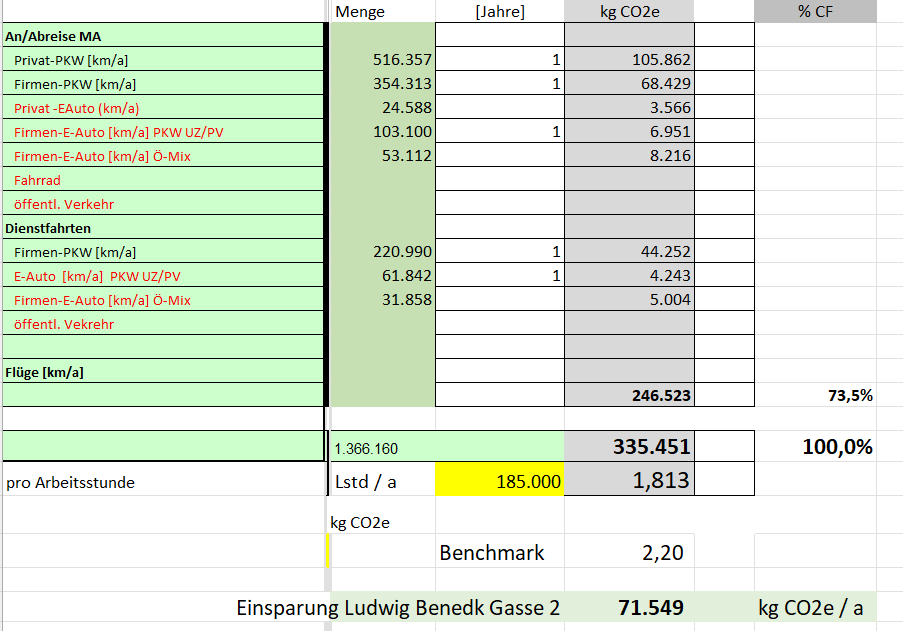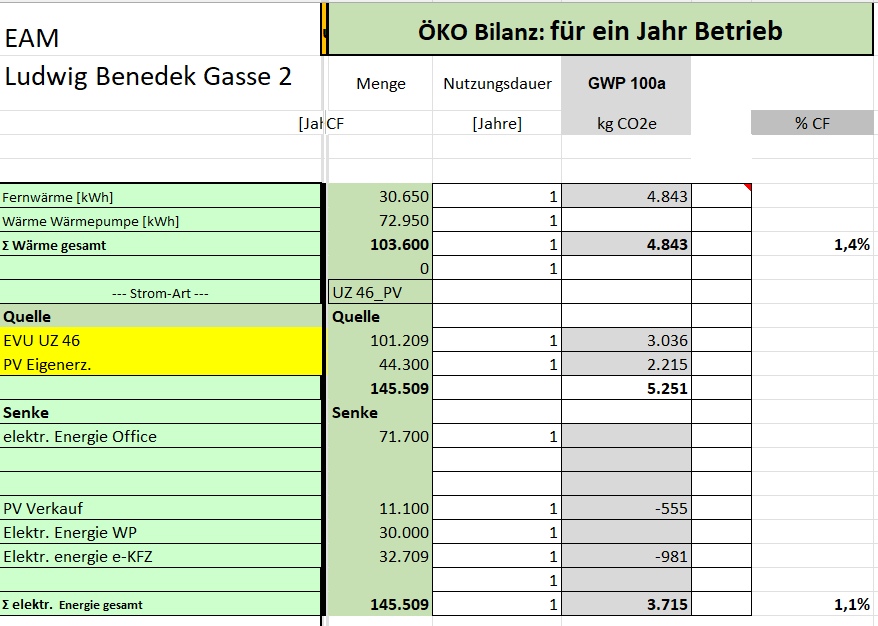 Zubau 750 m2 BGF unter Berücksichtigung des Bestands (1000 m2 BGF); Fokus auf regionale Dienstleister; Wärme / Kälte mittels Wärmepumpen (Fernwärme nur als Backup) ; Install. PV mit 40 kWp; 9 Ladestationen für derzeit 16 eKFZ (240.000 km/a davon 160.000 im Hause); insgesamt wird nur Energie von der Naturstrom AG (UZ 46) und Eigenerzeugung als Quelle genutzt; Zusammenarbeit mit ökol. Innenarchitekten (SSSC) und Kreislaufwirtschaftsspezialisten (ZweckZwei) bei Ausstattung (Recycling Bodenbelege-gebrauchte Einrichtungsgegenstände ...); intensive und extensive Dach/Fassadenbegrünung (insgesamt 205 m2); Gesamtökobilanzierung -CO2e Impact/a des Gebäudes und des Betriebes mit 110 MA (Energie, Errichtung Geb., Mobilität MA, Betriebsmittel ...)